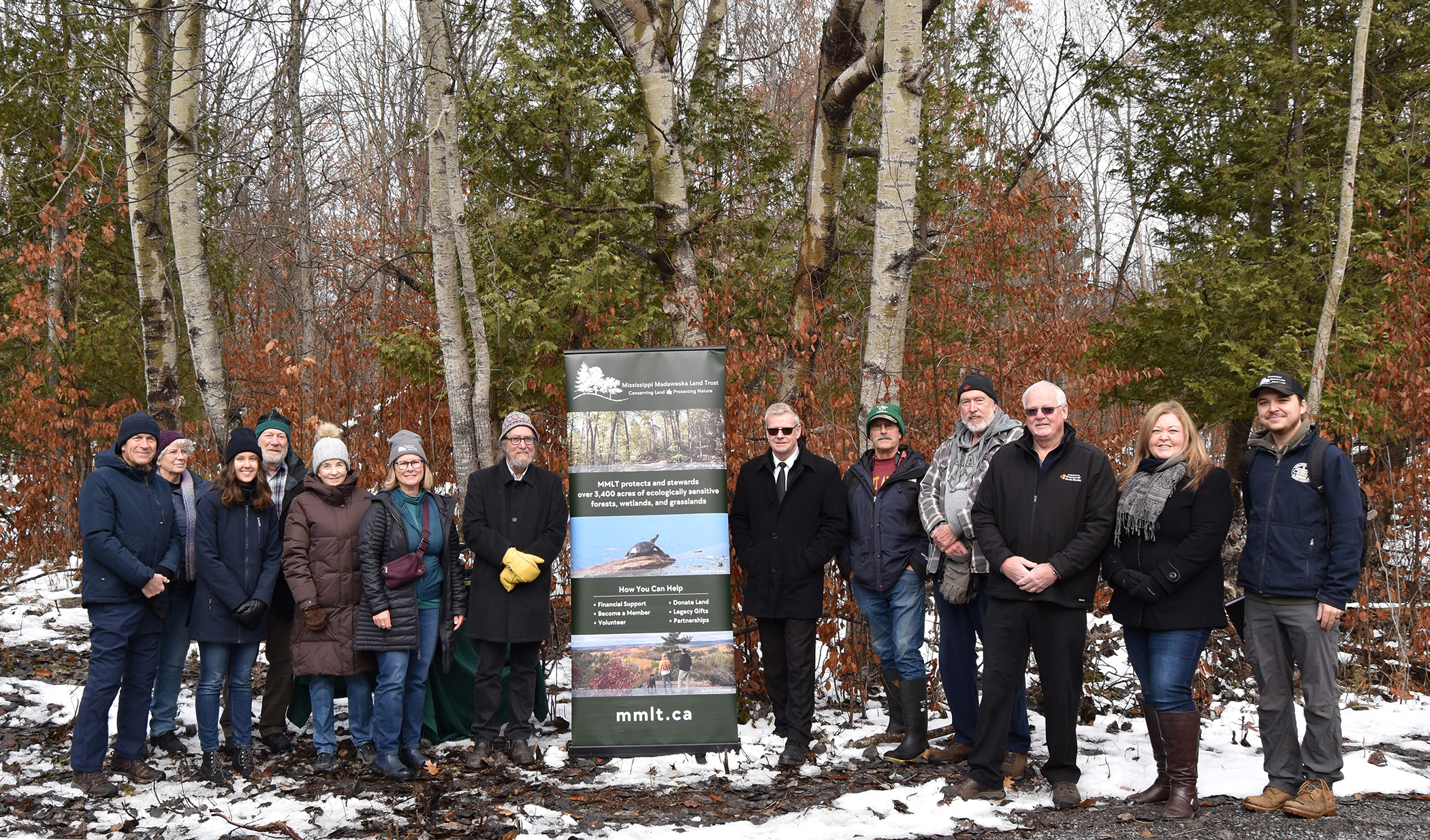 From left, Don Johnston, Pip Winters, Emily Moynes, Paul Frigon, Georgina Wigley, Stacie Lloyd, Stephen Kotze, MPP John Jordan, Steve Miller, Bob Betcher, Steve Fournier, Mississippi Mills Mayor Christa Lowry, and Andrew Dunbar pose in the Poole Family Nature Sanctuary following improvement made possible through a $17,400 OTF grant. Courtesy the MMLT
