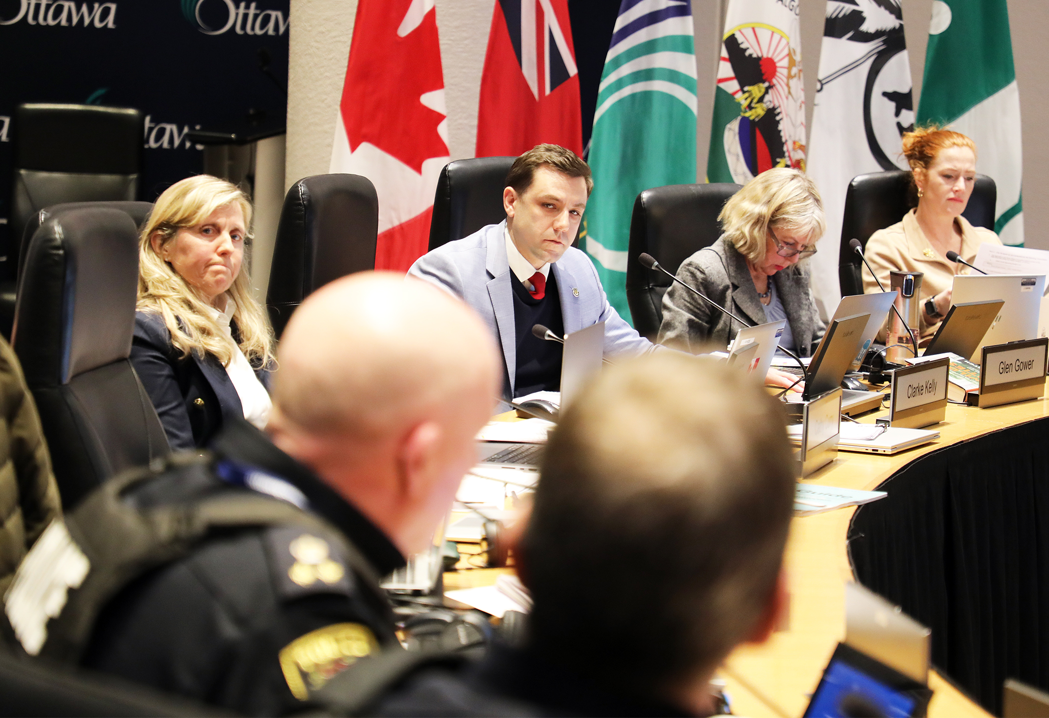 West Carleton-March Coun. Clarke Kelly, centre, asks questions to Ottawa Police Service Chief Eric Stubbs and deputy Chief Steve Bell during a 10-hour budget meeting Wednesday, Dec. 10 at Ottawa City Hall. Photo by Jake Davies