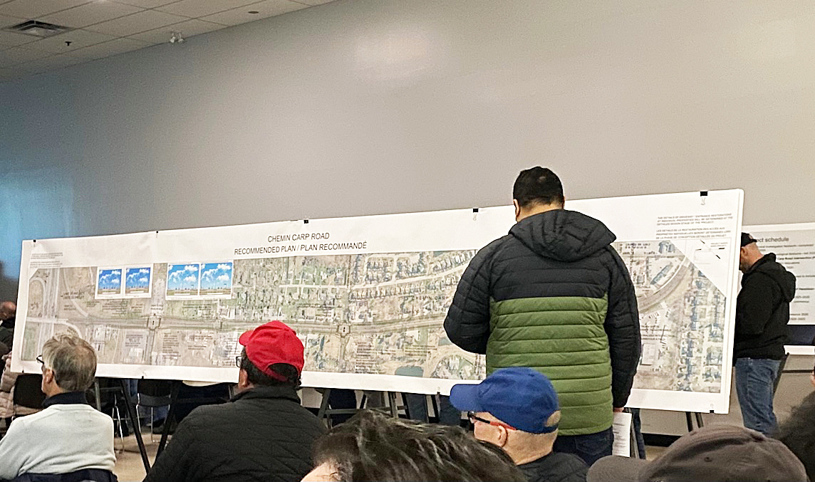 Many attendees stepped up for a close look at the city’s Carp Road Recommended Plan, a 20-foot-long visual of the proposed project, before and during the Nov. 13 Carp Road open house organized by the City of Ottawa. Photo by Nonie Smart