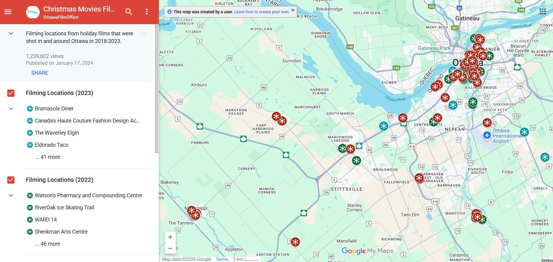 Movies were filmed all over Ottawa in 2025 and this Google map shows some of the locations across the city. Courtesy Google Maps