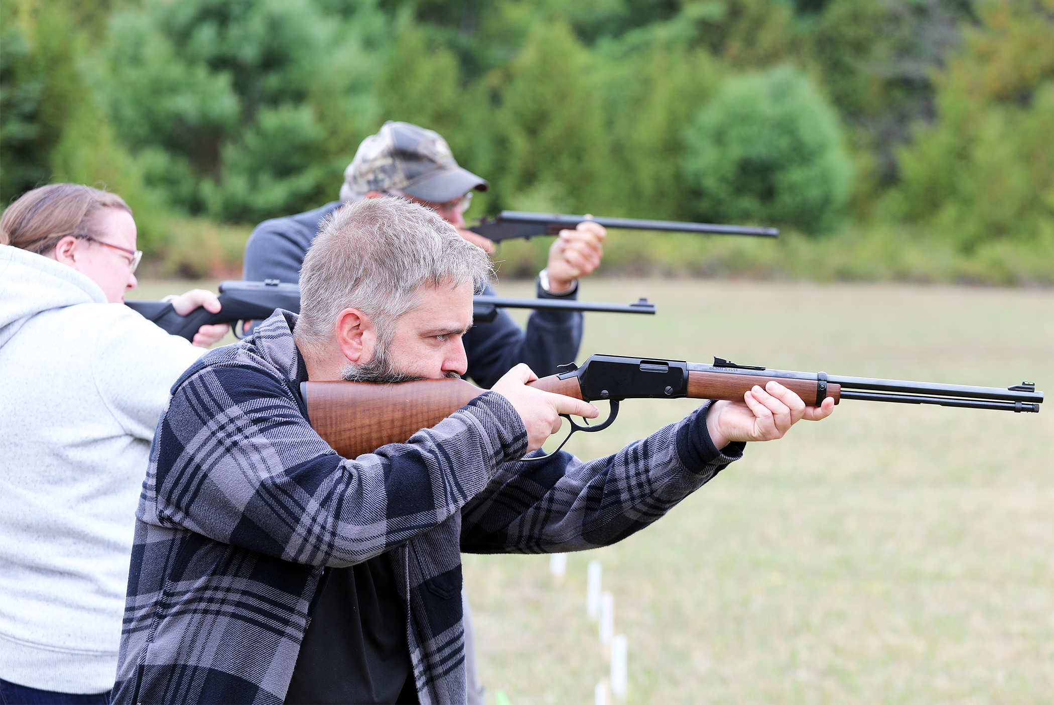 From near to far, WCFGC members Jason Chandler, Allison Ferguson and Kenny Boyd aim down their sites with one shot to break the three-way tie for third place in a target shooting event last fall. Photo by Jake Davies