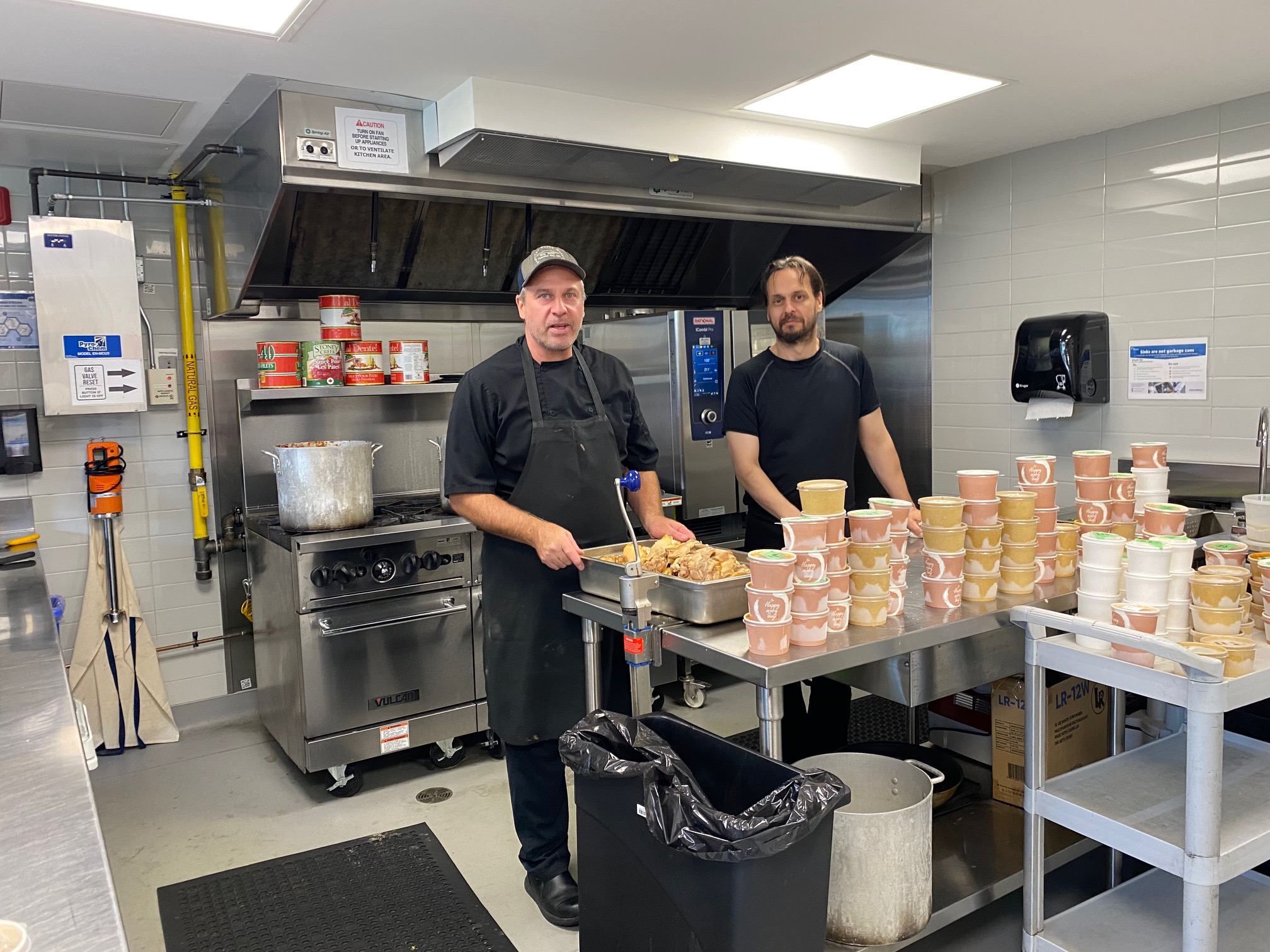 From left, cooks Mike Hargreaves and Robert Ford bring decades of cooking experience to the kitchen that prepares thousands of Meals on Wheels entrees per year. Photo by Nonie Smart